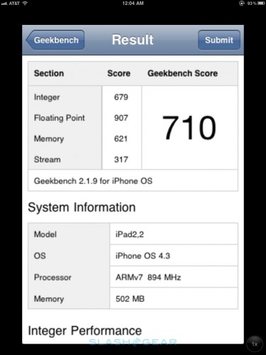 A memória que era até ao momento desconhecida é reportada pelo mesmo programas como sendo 512 MB (parte da memória está usada pelo sistema, e daí os 502 MB apresentados), o que se revela o dobro do iPad original.