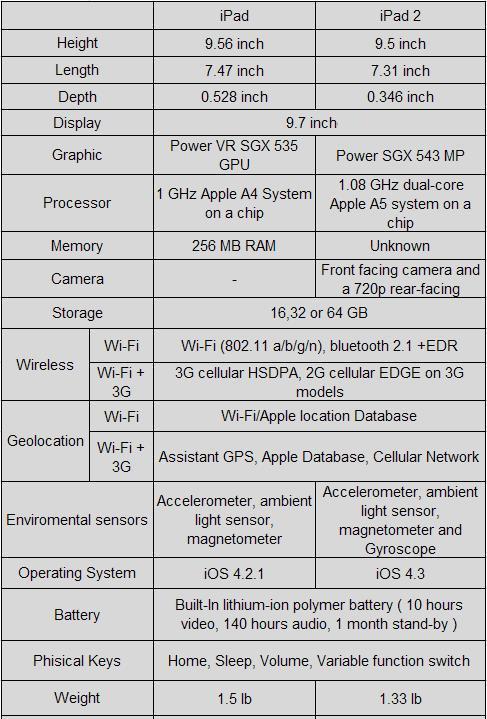 A tabela que se segue, e algo desatualizada face aos specs reais, é relativamente sucinta e eficaz na comparação entre os dois tablets da Apple, comparando tudo desde a duração da bateria, às capacidades do tablet, dimensões, etc.
